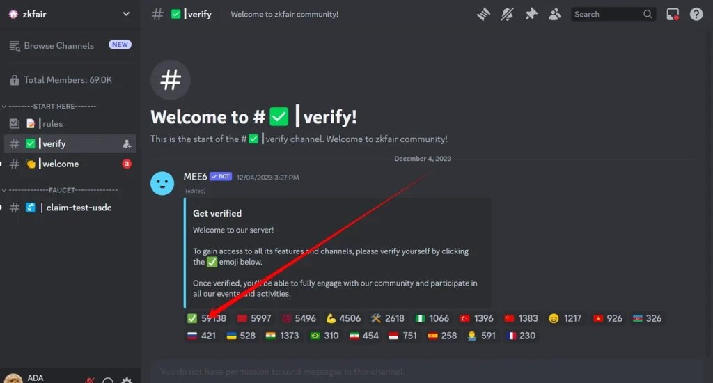 2단계: 인증 채널로 이동하여 ✅를 클릭하세요.