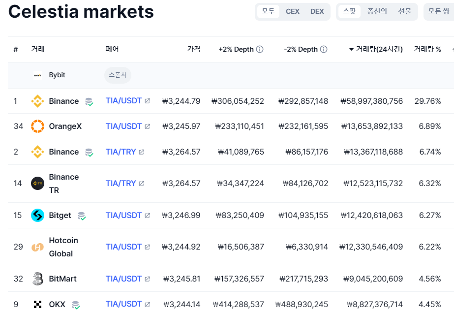 전세계 셀레스티아(TIA) 코인의 거래량을 코인마켓캡 기준으로 보면 바이낸스에 약 40%(3개의 거래쌍을 합친 퍼센테이지)가 거래되고 있어 바이낸스에 몰려있는 것을 볼 수 있습니다. 이 외에 비트겟, 핫코인, 비트마트, OKX의 4개 거래소에 분포되어있는 거래량은 약 22%정도입니다.