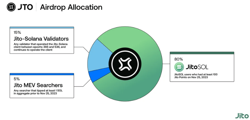 앞서 지토는 에어드랍 물량 1억개 중 80%(8천만 JTO)는 자격 조건(11/25까지 100포인트 이상 보유)을 갖춘 JitoSOL 이용자에게 할당되며 15%(1,500만 JTO)는 지토-솔라나(Jito Solana) 검증자에게, 5%(500만 JTO)는 지토 MEV 조사관(searcher)에게 할당된다고 밝힌 바 있습니다.