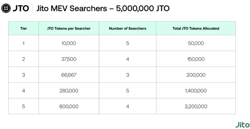 지토 MEV 조사관 주소는 5가지 레벨로 나뉘며, 그 중 더 활동적인 조사과(searcher)가 더 많은 할당을 받게 됩니다. 구체적인 할당은 아래 그림과 같습니다. Jito MEV 검색자에게 에어드랍된 JTO의 50%만 토큰 생성 시 청구할 수 있으며 나머지 50%는 12개월 이내에 선형적으로 잠금 해제됩니다.