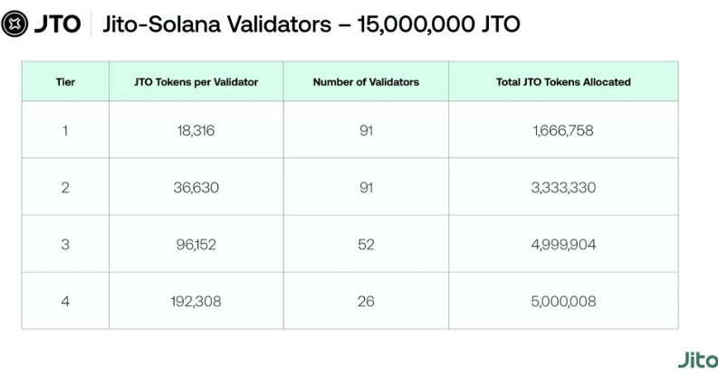 총 1,500만 개의 JTO가 다음 규칙에 따라 Jito-Solana 검증자에게 배포됩니다.