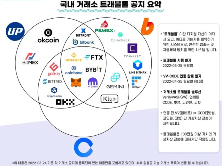 해외 거래소를 이용하려는 분은, 국내 거래소 사이에 암호화폐 송금 및 인출이 가능한지를 반드시 확인해야 합니다. 지난해 3월 트래블룰 적용 이후 국내 거래소는 이에 대해 지속적으로 공지를 내고 있습니다. 아래는 지난해 3월 트래블룰 적용 시점에 민티드랩이 작성한 도표로, 각 거래소 공지를 종합해 어느 거래소 간의 송금 및 인출이 가능한지를 보여줍니다. 참고하시기 바랍니다.