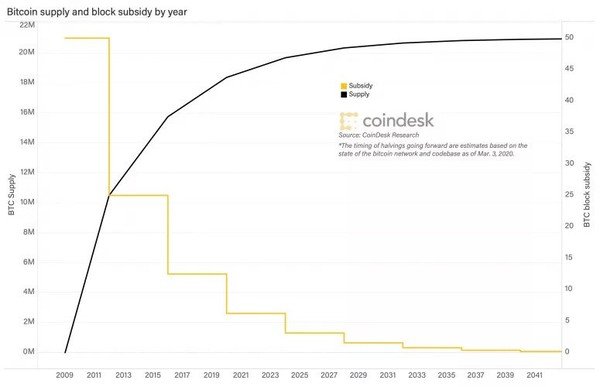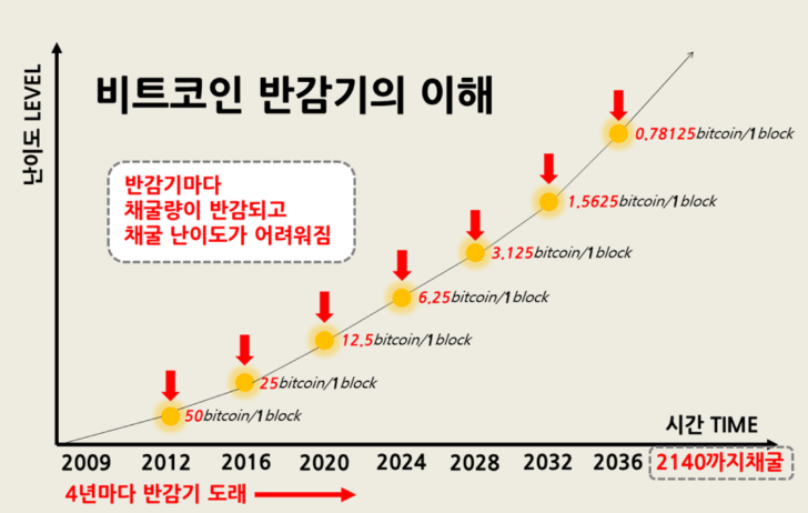 블록 21만 개가 쌓일 때마다, 시간으로 환산하면 대략 4년 주기로 비트코인 채굴에 대한 보상 금액이 절반으로 줄어든다. 이 시기를 반감기라고 한다.