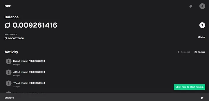 3단계: 광석 채굴을 시작하려면 오른쪽 하단에 있는 “시작하려면 여기를 클릭하세요”를 클릭하세요.