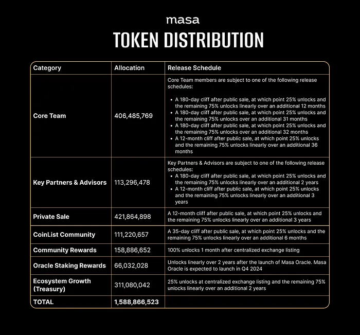 MASA 토큰의 총 공급량은 1,588,866,523 $MASA이며 초기 토큰 분배는 다음과 같습니다.