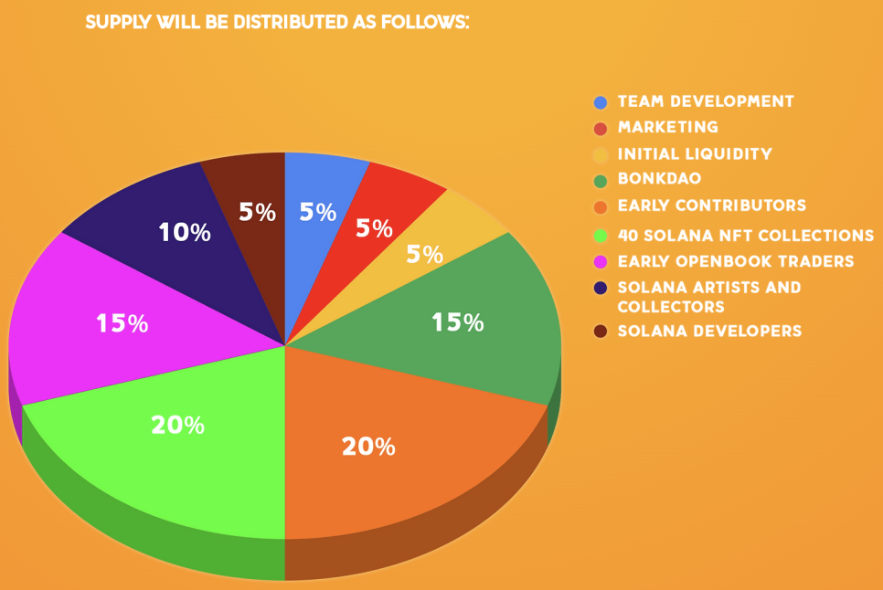 공식 홈페이지에 따르면 봉크 토큰 공급의 50%는 솔라나 커뮤니티를 대상으로 대규모 에어드롭을 하기로 결정하면서 SOL이 본격적인 수혜를 입었습니다. 에어드랍 물량은 봉크 전체 물량의 절반에 달합니다. 봉크 에어드랍은 개인 NFT 보유자, 오픈북 트레이더, 솔라나 아티스트, 솔라나 개발자로 구성된 솔라나 커뮤니티를 대상으로 실시될 예정이다.