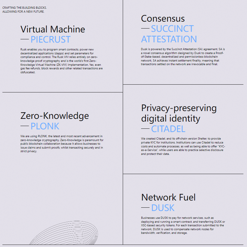더스크 네트워크(DUSK)는 비즈니스 컴플라이언스 표준을 준수하는 개인 정보 보호에 초점을 맞춘 스마트계약을 표방하고 있으며 기밀화된 형태의 스마트 컨트랙트를 지원하는 레이어 1 플랫폼입니다.