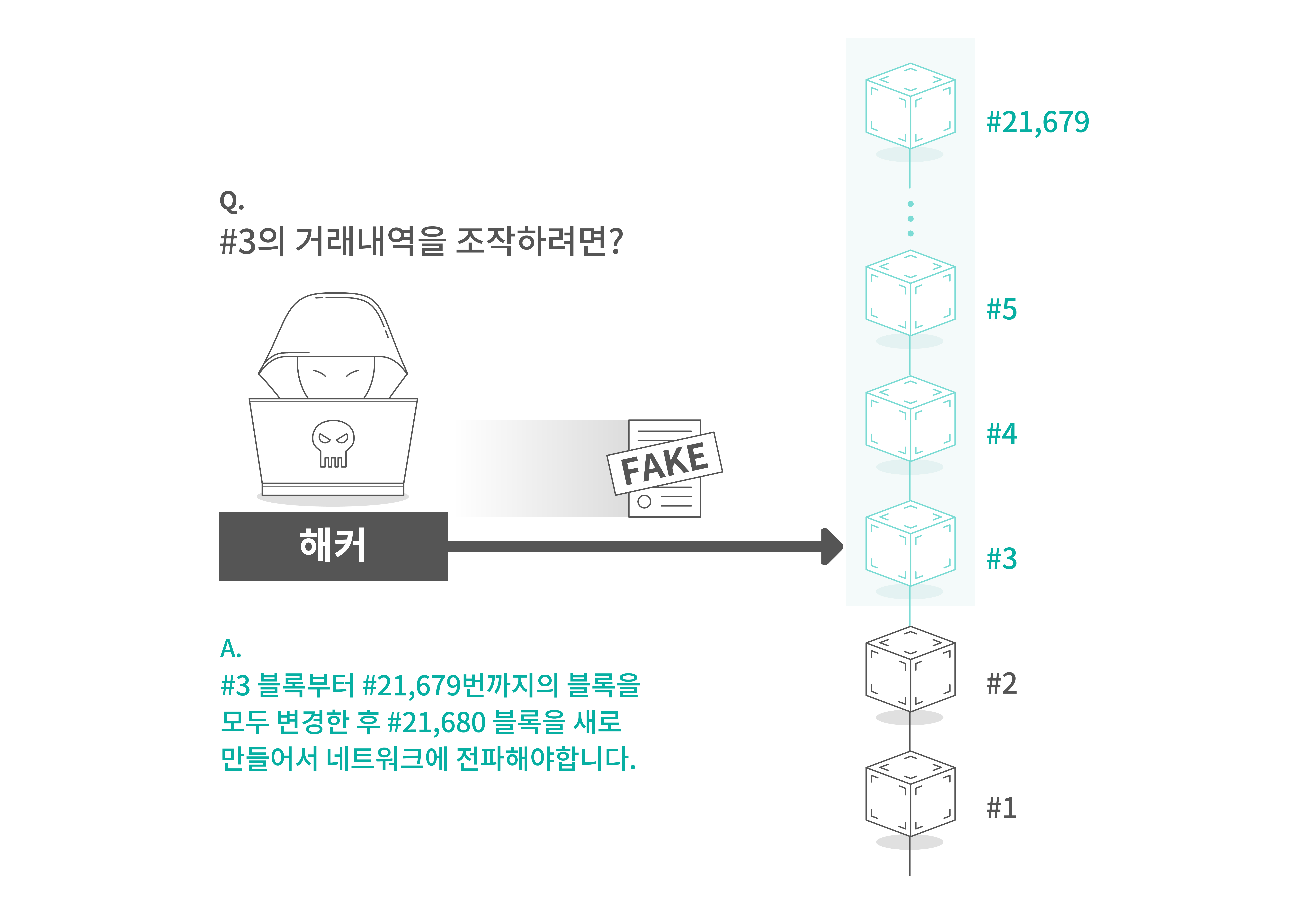 하나의 블록을 생성할 때마다(하나의 문제를 풀때마다) 충분한 연산량이 필요하고, 또 그위에 생성되는 블록은 더 많은 연산량을 필요로 합니다. 이렇게 블록이 쌓이다 보면 이전의 거래내역을 조작하려면, 기존 블록들을 다 변경해야 하겠지요. 더해서, 지금 네트워크에 참여하고 있는 채굴자들이 선택하는 가장 긴 체인보다 더 빠르게 길이를 늘려나가야 합니다.